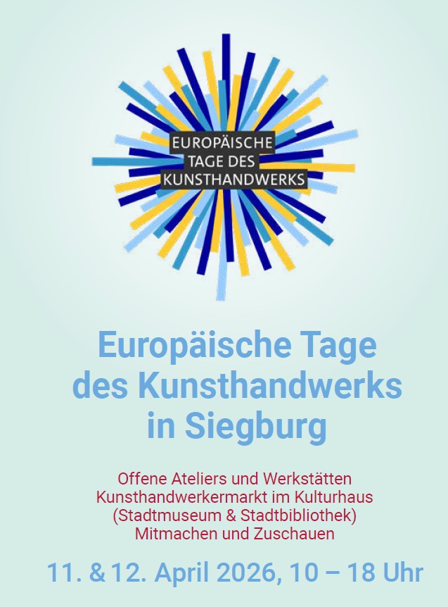 Am 11. und 12. April 2026 öffnen die Kunst- und Kunsthandwerksschaffenden aus Siegburg erneut ihre Werkstätten und Ateliers. Zudem werden nationale KunsthandwerkerInnen ihre Arbeiten im Kulturhaus präsentieren, weitere Facetten des Kunsthandwerks vorstellen und sowohl zum Mitmachen als auch zum Zuschauen einladen. Klein.Fein.Professionell.